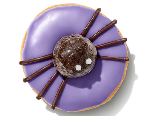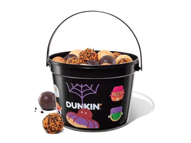As is now tradition, Dunkin is also bringing back its Spider Specialty Donut, a glazed donut topped with purple icing and a chocolate Munchkin Spider sitting in the middle. Or you can order a whole Halloween Munchkins Bucket, 50 Munchkins in a cute plastic pail decorated with illustrations of smiling, costumed Munchkins and complete with a lid that looks like the Spider Donut.