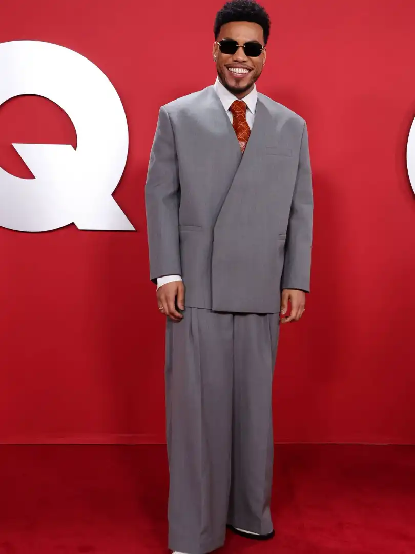 Anderson.Paakepitomized avant-garde polish at the GQ Men of the Year Awards in a sculptural Jacquemus ensemble that married modern experimentation with classical sophistication. His gray suit, built around an asymmetrically wrapped jacket, featured clean architectural lines that enhanced the proportions without overwhelming his frame. Wide-leg trousers introduced a relaxed cut, while a crisp white shirt and orange-patterned tie broke the restraint with a precise, artful flash of color. Dark round sunglasses and .Paak’s signature grin sealed the moment, making the look feel playful, unexpected and effortlessly fashionable.