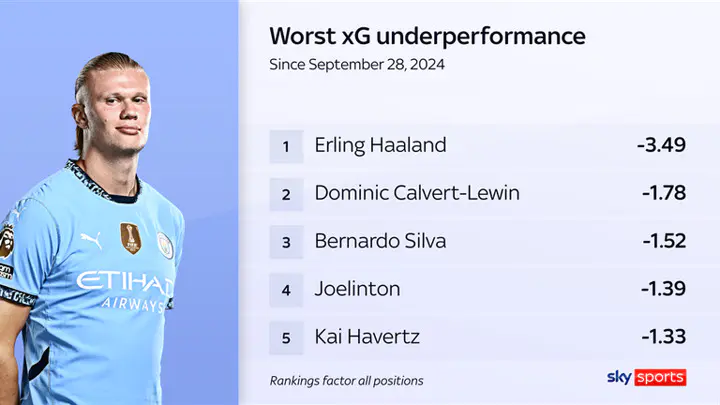 Haaland is the most under-performing Premier League player in terms of Expected Goals since that date - by quite some distance. Team-mate Bernardo Silva is third on that list.